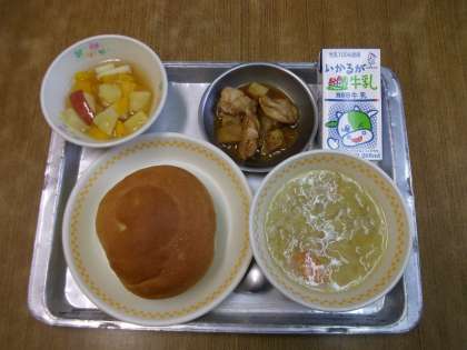 今日の給食は,お楽しみ献立の「ソフトパン,牛乳,タンドリーチキンポテト,マカロニスープ,とろりフルーツコンポート」でした。