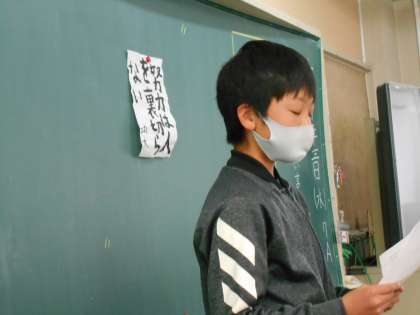「座右の銘」の発表会をしました。それぞれの思いや経験と重ねて文章を書いている子もいました。聞いている人も真剣に友だちの話を聞くことができました。今回の発表会でまた一つ新しい言葉を知ったり、人との考え方の違いを気づくことができましたね。