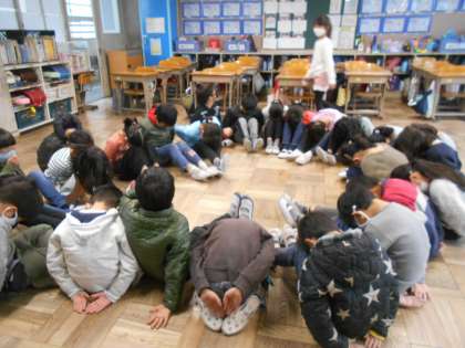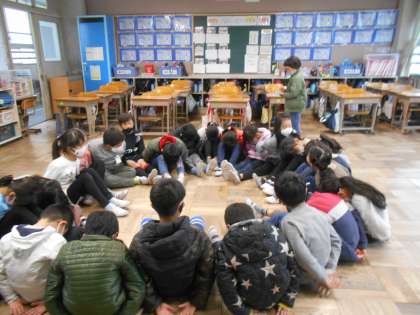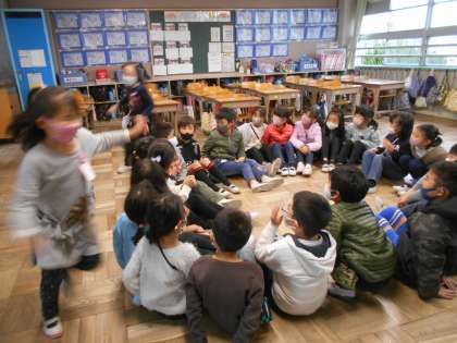雨が降ってきたので,教室でみんな遊びをしました。ハンカチ落としで大盛り上がりです。