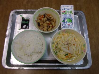 今日の給食は「ご飯,牛乳,親子うどん,五目豆,のりの佃煮」でした。