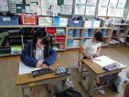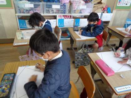 凧あげの凧に描く絵の下書きをしました。テーマは「将来の夢」で、ユーチューバーや警察官、ケーキ屋など、自分のなりたい職業や仕事の絵を描きました。