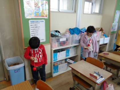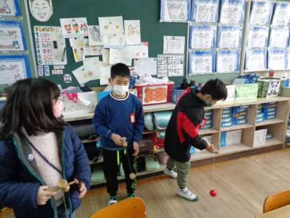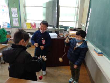昔遊びのけん玉をしました。みんな上手に皿の部分に玉を乗せていました。