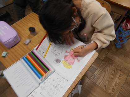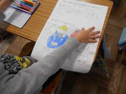 「泣いた赤鬼」のお話を読み,このあと赤鬼が笑顔になれるような続きのお話を考えました。今日は下書きに取り組んでいます。
