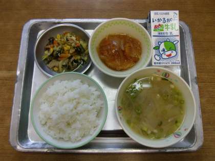 今日の給食は「ご飯,牛乳,豆腐ハンバーグの野菜あん,小松菜の塩こうじ炒め,みそ汁」でした。