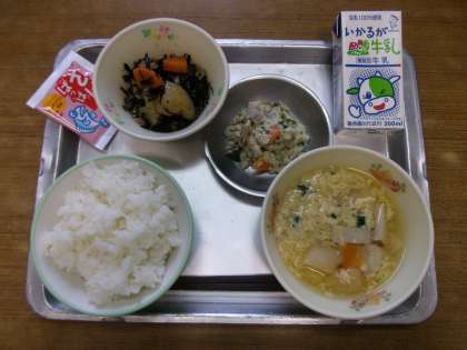 今日の給食は「ご飯,牛乳,じゃが芋のいそ煮,レンコンの白和え,むらくも汁,ふりかけ(さけぱっぱ)」でした。