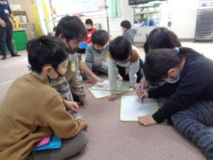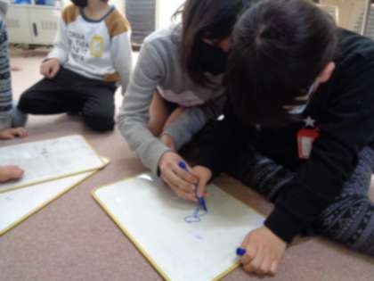 『冬の絵しりとり』をしました。4人の児童が司会進行を頑張ってくれました。だれが絵を描くか決める際は、「じゃんけんしよう!」、「まって、1年生からにしたら?」と話し合って決めていました。