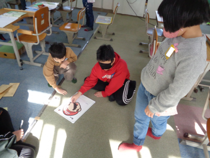 福笑いも楽しみました。友だちに、「これは右目だよ。」と説明しながらパーツを渡していました。