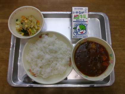 今日の給食は「ご飯,牛乳,ハヤシライス,ホットサラダ,手作りドレッシング」でした。