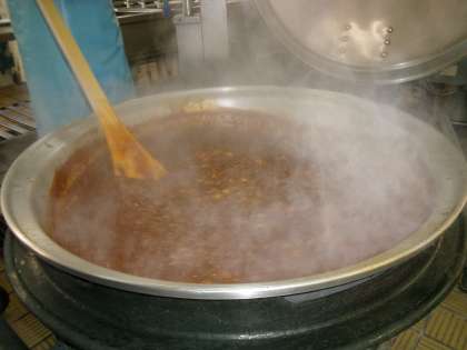 調味料を入れてからは焦げやすいので,大きな釜に付きっきりで混ぜてコトコト煮て作りました。
