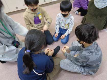 今日のなかよしタイムでは,雨の日でも,道具が無くても遊べる日本の伝承遊びを行いました。