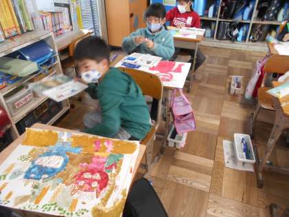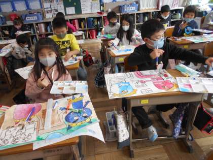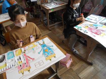 「ないた赤鬼」の続きのお話の絵を描いています。鬼や背景に色がつき,昔話の雰囲気が出てきました。