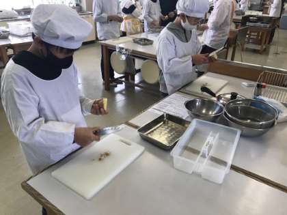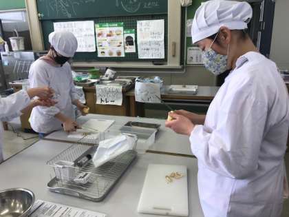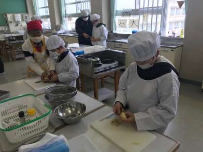 こふき芋の調理実習でした。慎重に包丁を使います。