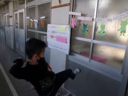 今日は124年ぶりの2月2日が節分です。自分の心の中から追い出したいおにに向けて,新聞を丸めて豆まきをしました。