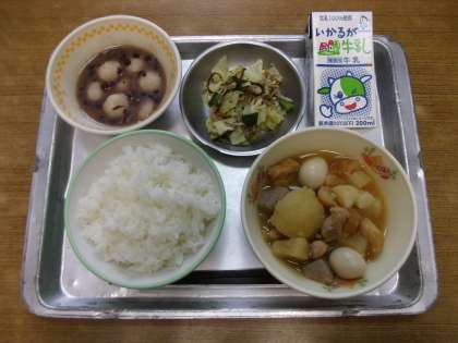 今日の給食は「ご飯,牛乳,おでん,浅漬けサラダ,白玉ぜんざい」でした。