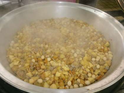 給食の「おでん」は,大きな釜にたくさんの具材を入れてコトコト煮てつくります。