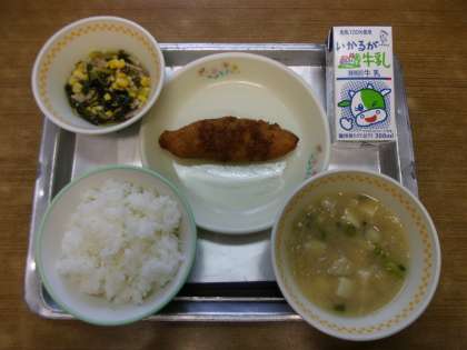 今日の給食は「ご飯,牛乳,サーモンフライ,手作りソース,小松菜のソテー,みそ汁」でした。