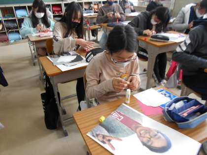 自画像の貼り絵を作っています。根気のいる工作ですが、出来上がりが楽しみです!