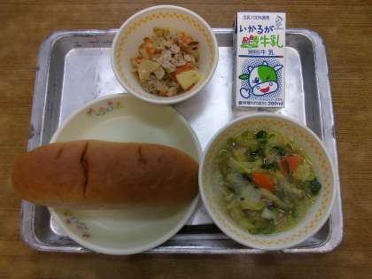 今日の給食は「黒糖パン,牛乳,豚肉のマスタード焼き,はくさいスープ」でした。