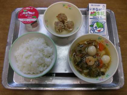 今日の給食は「ご飯,牛乳,焼きシュウマイ,八宝菜,フルーツゼリー(アップル)」でした。