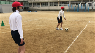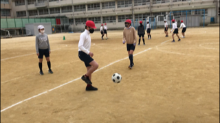今日はグリッドサッカーです。なかなか息を合わせるのは難しいですが,シュートが決まると楽しいね。