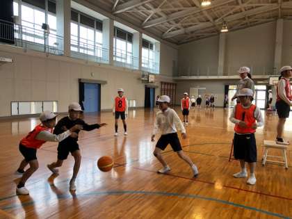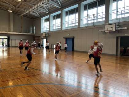体育館の体育では,パスやシュート練習を中心に取り組んでいます。パスをもらうときは,相手に声をかける習慣がつくようになってきました。