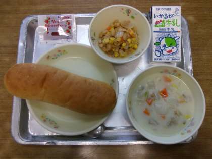 今日の給食は「大麦パン,牛乳,かぶのクリームシチュー,ビーンズサラダ,手作りドレッシング,いちごジャム」でした。