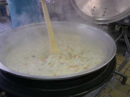 ホワイトルウと牛乳を入れた真っ白いクリームシチューは,焦げやすいので,釜に付きっきりで混ぜて作りました。
