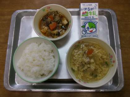 今日の給食は「ご飯,牛乳,韓国風すき焼き,トック」でした。
