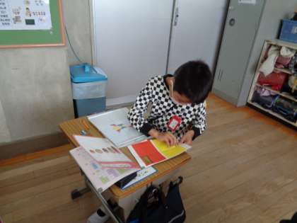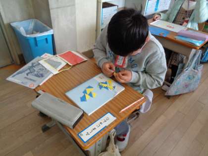 色板を使っていろいろな形を作りました。魚や花、家など、組み合わせ方を考え、自由に作りました。