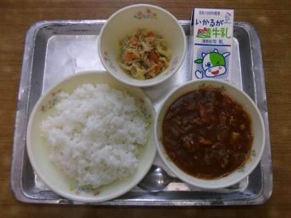 今日の給食は「ご飯,牛乳,ハヤシライス,ごぼうサラダ,手作りドレッシング」でした。