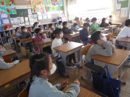 今年度は,ビデオでのお別れ集会でした。各学年のメッセージを楽しく観ました。6年生の演奏には,拍手喝采でした。