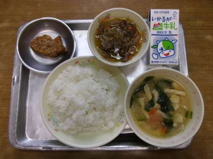 今日の給食は,「ご飯,牛乳,牛丼,打ち豆汁,鯛焼き」でした。
