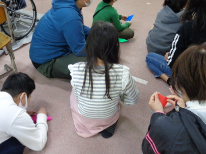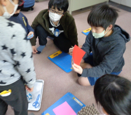その後は、折り紙を折って切り開き、花をつくる製作をしました。折り紙の色を選ぶ際には、「〇〇さん、どの色がいい?」と、高学年が低学年に聞いてあげていました。