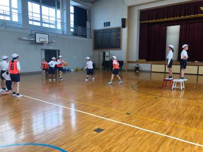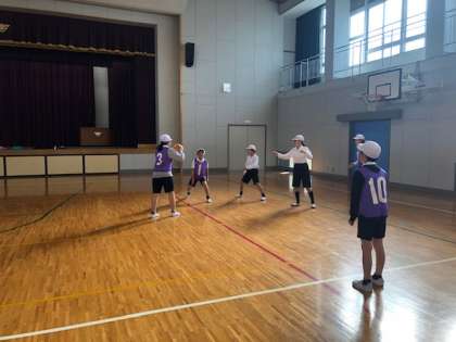 体育館では,バスケットボールをしています。パスを回すときには,声をかけあって取り組んでいます。