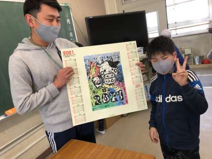 彫刻刀で彫って,ローラーでインクをつけて,バレンでこすって,刷り上がった版画に色をつけて,カレンダーの台紙に貼り付けました。