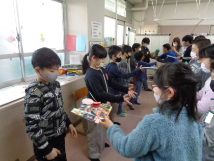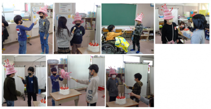 続いて、3学期にお誕生日を迎えた友だちを、みんなでお祝いしました。インタビューで「何歳になりましたか?」、「何を頑張りたいですか?」、「将来は何になりたいですか?」と聞いていました。プレゼントのフォトフレームをもらって大喜び!休み時間の度に見に行っていました。誕生日でない友だちも興味津々で見ていました。