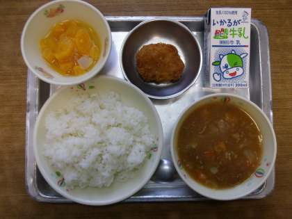 今日の給食は,卒業お祝い献立の「ご飯,牛乳,米粉カレーライス,チキンカツ,オレンジポンチ」でした。