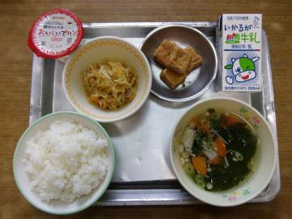 今日の給食は「ご飯,牛乳,厚揚げのしょうが焼き,切り干し大根の炒め煮,すまし汁,プリン」でした。