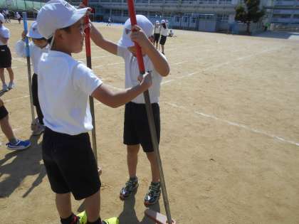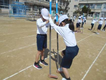 2年生最後の体育は,竹馬に挑戦しました。友だちに助けてもらいながら,先週と比べるととても上達しました。