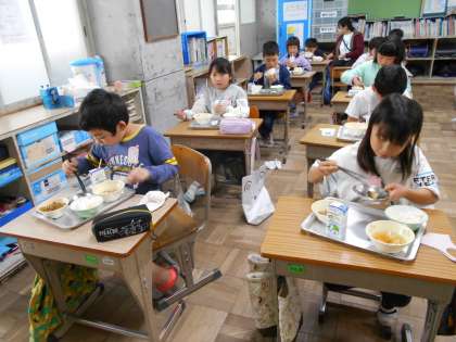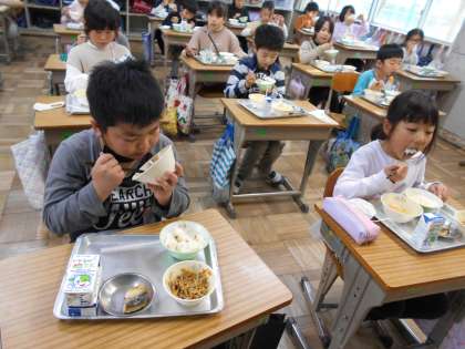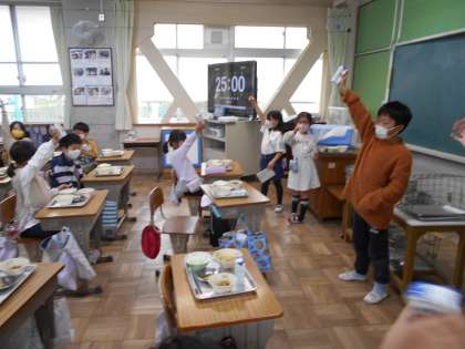 2年生で食べる給食は、今日が最後です。春休み中に誕生日がある友だちに、乾杯をしました。