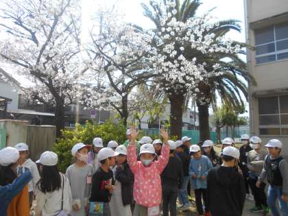 お天気が良く,桜もきれいに咲いていたのでプチ花見をしました。花びらが散っていて,夢中で拾い集めていました。