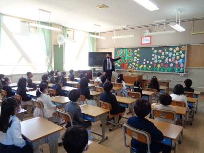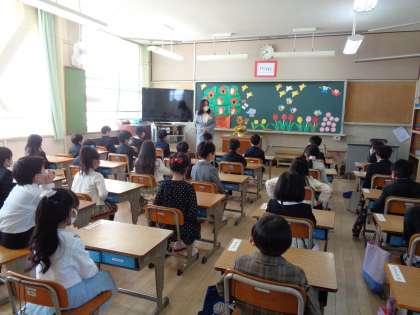 入学式後教室に戻り,担任から話がありました。学校名,学年,クラス,担任の名前を大きな声でみんなで言うことができました。学年目標「わくわく」と学校生活が送れるように,東浅香山小学校の約束を守って過ごしていきましょう。明日も会えるのを楽しみに待っています。