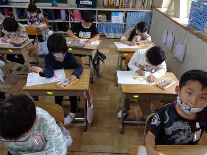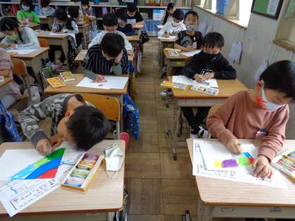 クレヨンでスクラッチの技法を学習します。今日は,画用紙一面にいろいろな色を塗りこみました。