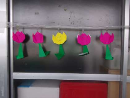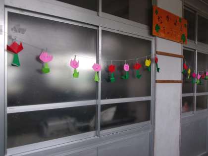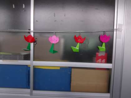 なかよしタイムでは,4月の教室前掲示を制作しました。春の花「チューリップ」を飾り,教室前が華やかになりました。