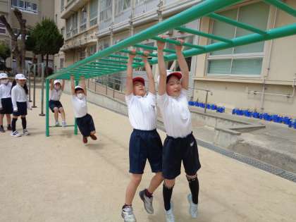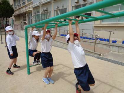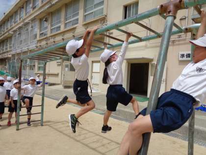 今日は運動場でうんていをしました。じょうずな友達を見つけて,どうすればうまくできるか考えました。足をぶらぶらとふればいいことに気が付いていました。