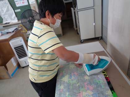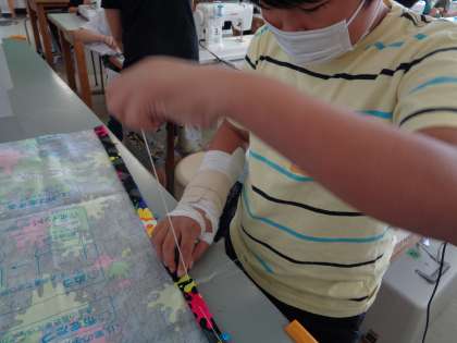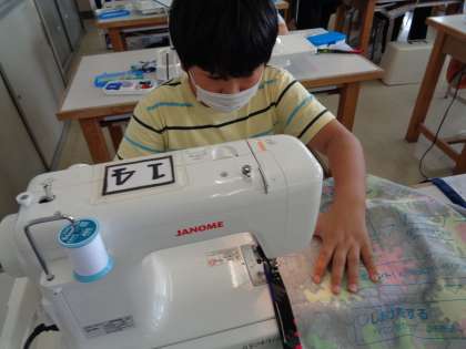 エプロン作りです。玉結び、玉止めが上手にできました。