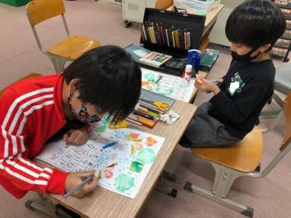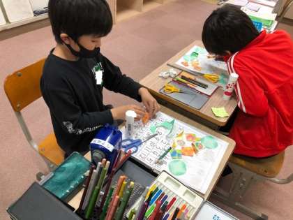 て,台紙に貼り,色鉛筆で雨,雲,傘など自由に描きました。