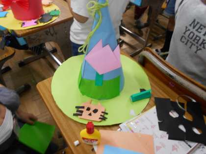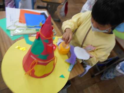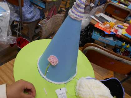 ぼうしの飾りつけを始めました。折り紙を折って貼ってみたり,毛糸で花を作ってみたり…,いろいろな工夫がつまったぼうしになりそうです。