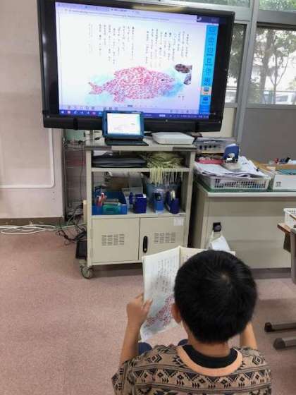 その後,テレビ画面から範読を聞いて,お話の確認をしました。