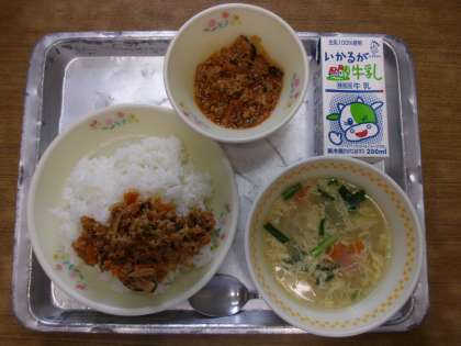 5月28日の給食は「ジャージャー丼、牛乳、にらたまスープ」でした。